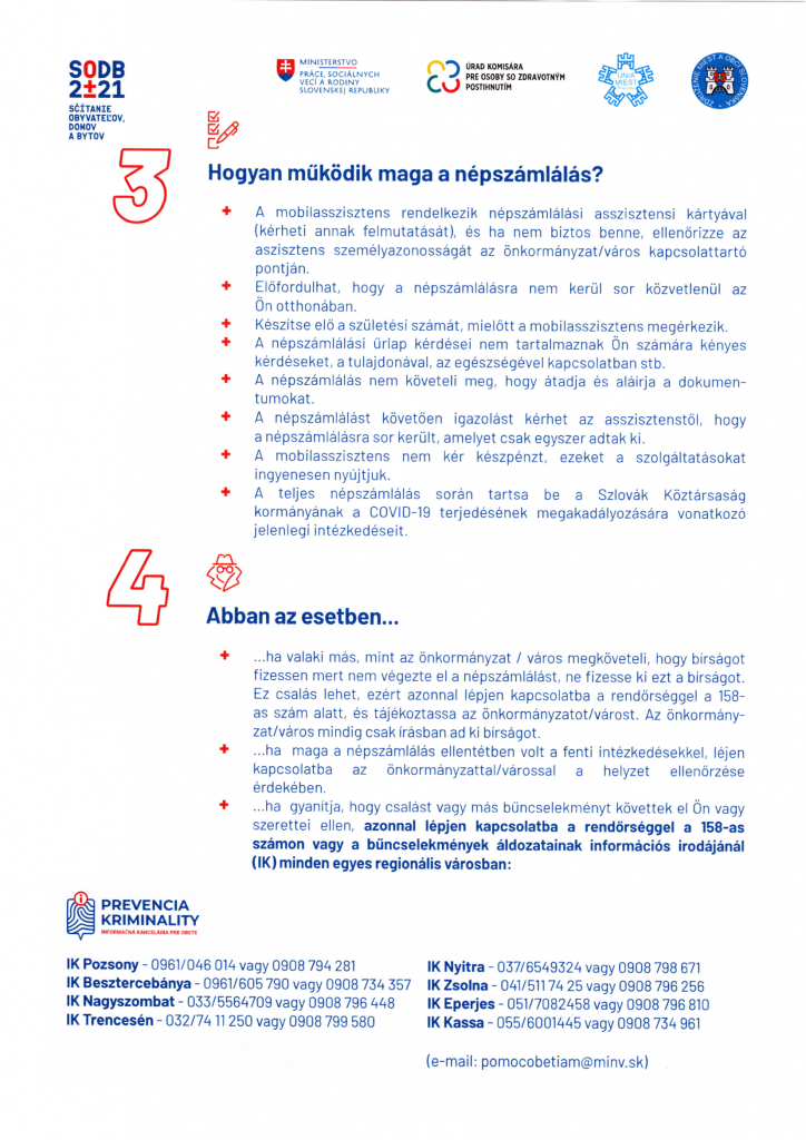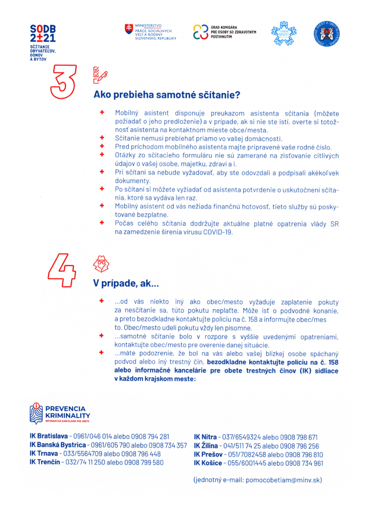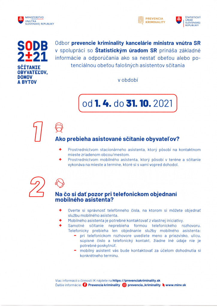 Oznamujeme obyvateľom, že asistované sčítanie obyvateľov v našej obci bude realizovať od 3. mája 2021 do 13. júna 2021. V uvedenom termíne budú k dispozícii stacionárni a mobilní asistenti. Na obecnom úrade bude zriadené kontaktné miesto, kde so sčítaním bude obyvateľom pomáhať stacionárny asistent v stránkových hodinách obecného úradu, v prípade požiadania aj v nestránkových hodinách. Vymenovaní sú aj mobilní asistenti, ktorí navštívia domácnosť obyvateľa a sčítajú ho v prípade, ak o túto službu požiada. Žiadame tých obyvateľov, ktorí sa z akéhokoľvek dôvodu nemohli sčítať sami prostredníctvom elektronického formulára, aby svoju požiadavku na elektronické sčítanie nahlásili na obecnom úrade osobne, alebo na telefónnom čísle 0911 211 862. Upozorňujeme obyvateľov, že sčítať sa je zákonom daná povinnosť a pri nesplnení tejto povinnosti je možnosť udeliť sankciu.