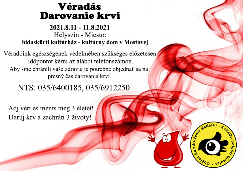 Občianske združenie KaKaDu, v spolupráci s Národnou transfúznou službou v Nových Zámkoch Vás srdečne pozýva na dobrovoľné darovanie krvi, ktorý sa uskutoční dňa 11. augusta, v stredu od 8.00 hod. do 11.00 hod. v priestoroch kultúrneho domu v Mostovej. Spravte všetko pre to, aby ste krv prišli darovať a tak pomohli tým, čo sú na vašu tekutinu odkázaní. Prineste si so sebou občiansky preukaz a preukaz zravotného poistenia. Deň pred odberom krvi vo večerných hodinách nejedzte mastné jedlá a nepite alkohol. Po úspešnom odbere krvi Vás čaká občerstvenie a malé prekvapenie. V záujme ochrany zdravia darcov krvi sa musí každý darca objednať na presný čas darovania krvi na nasledovných telefónnych číslach NTS: 035/6400185, 035/6912250. Organizátori všetkým vopred ďakujú za účasť.
