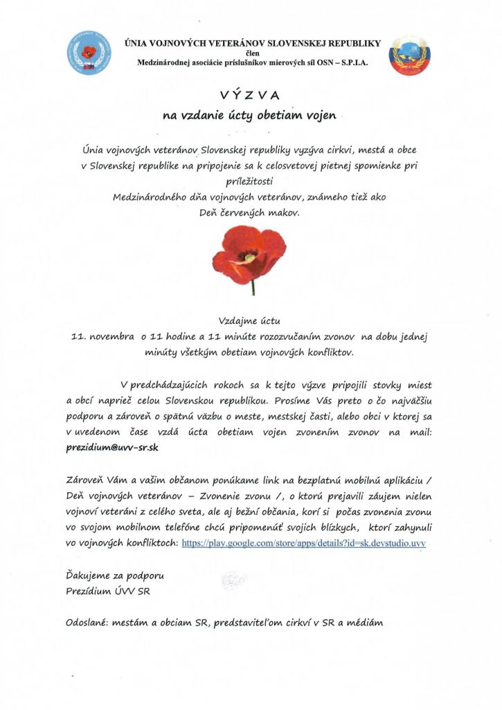 Dňa 11 novembra o 11:11 hod. v rámci Medzinárodného dňa vojnových veteránov si pripomenieme vojakov padlých v I. svetovej vojne rozozvučaním zvonov v každej obci na celom Slovensku. -