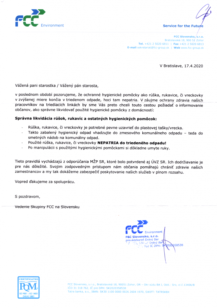 Chceli by sme upozorniť občanov, že ochranné hygienické pomôcky ako rúška, rukavice, či vreckovky nepatria do triedeného odpadu. Na základe odporúčania Ministerstva životného prostredia použité hygienické pomôcky je potrebné pevne uzavrieť do plastovej tašky/vrecka a hodiť do zmesového komunálneho odpadu – teda do smetných nádob na komunálny odpad. -