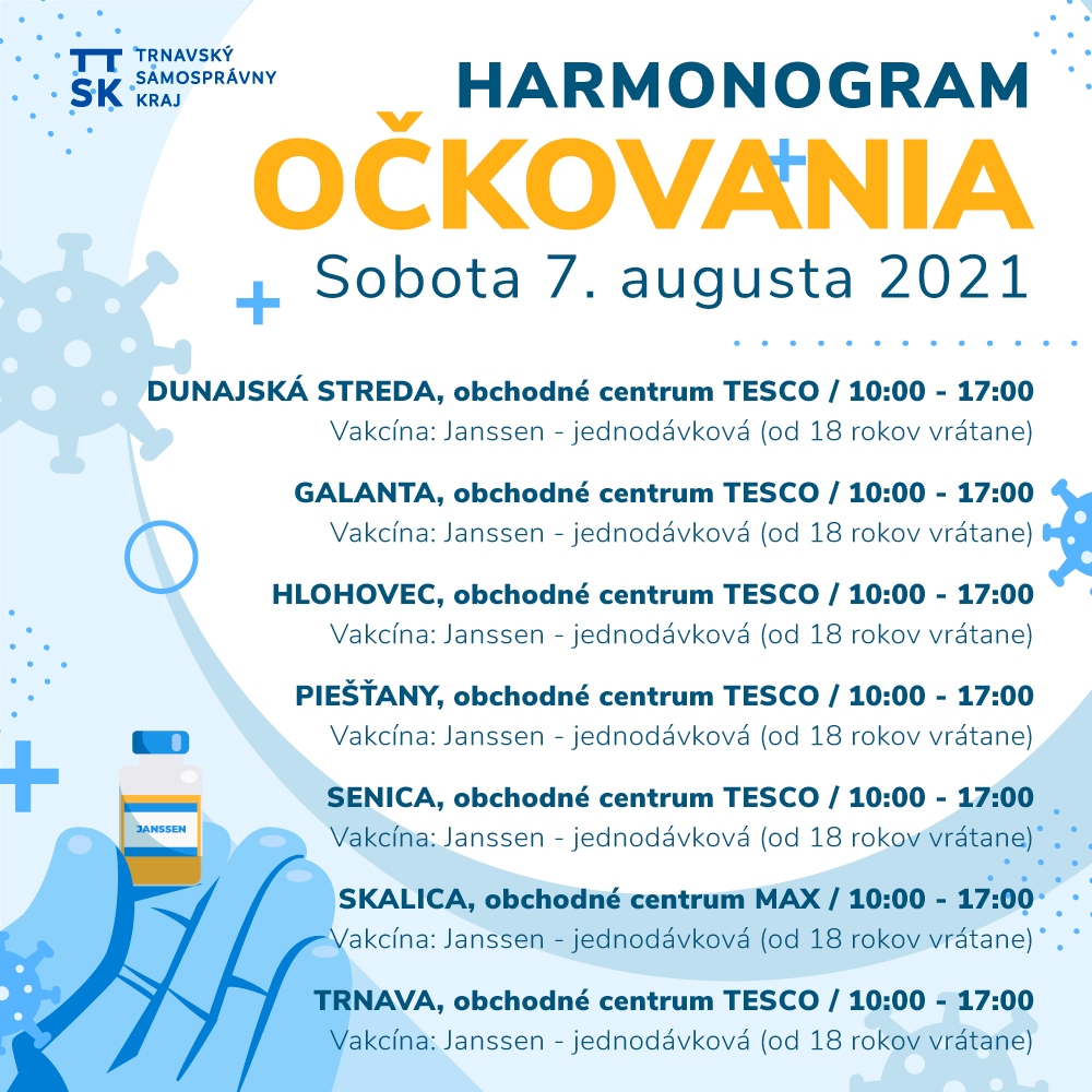 Dňa 7.augusta 2021, od 10.00 do 17.00 hod., v OC Tesco Galanta, Vakcína Janssen-jednodávková (od 18 r. vrátane). -