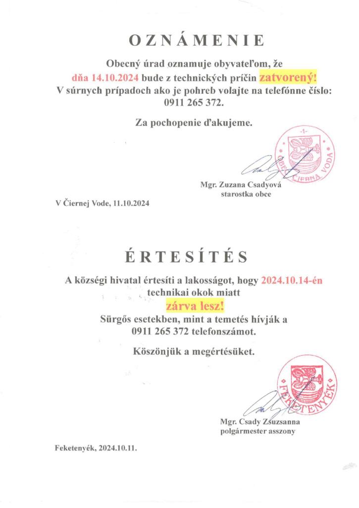 Oznámenie - Értesítés