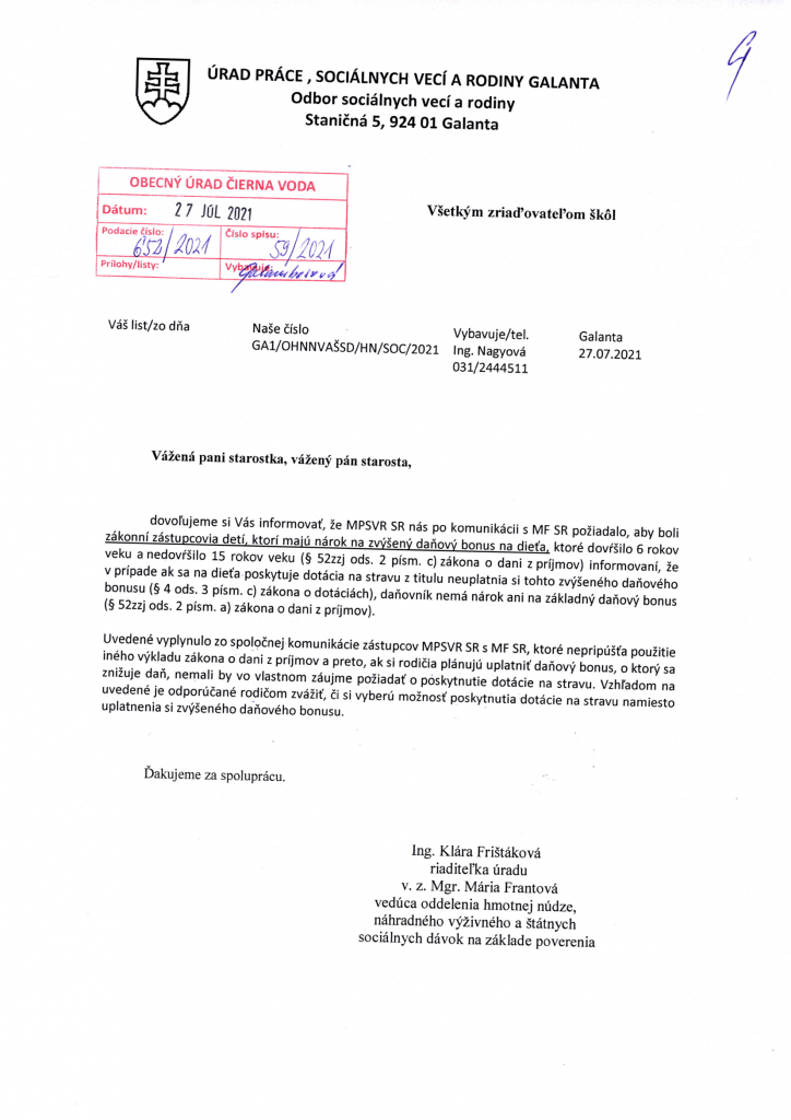 Poskytovanie dotácií na stravu v školskom roku 2021/2022- doplnenie - Étkezési támogatás biztosítása a 2021/2022-es tanévben - kiegészítés 1