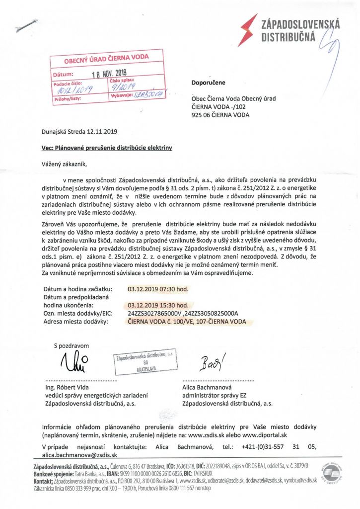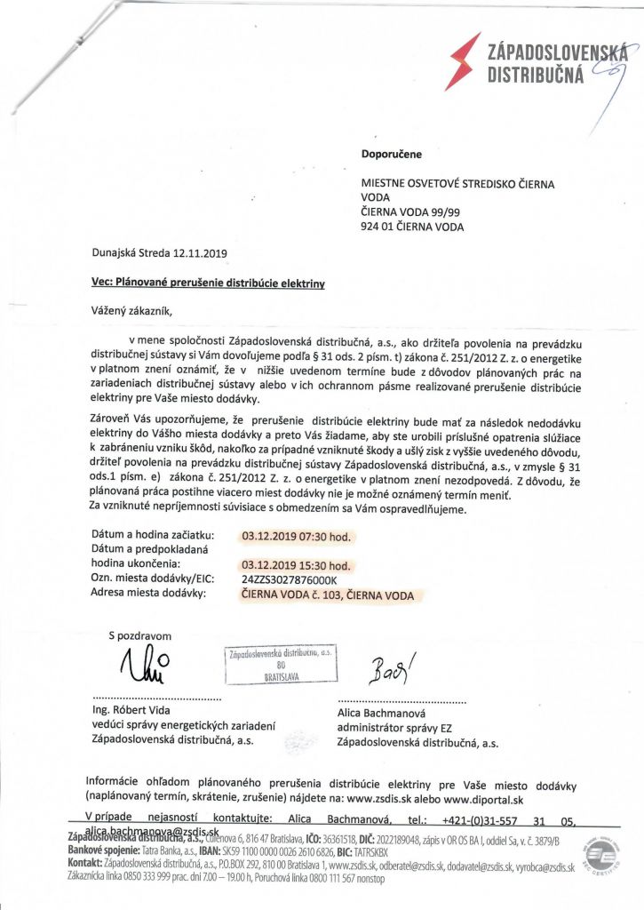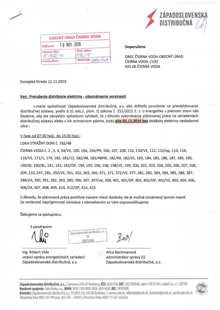Západoslovenská distribučná, a.s. társaság tudatja a lakosokkal, hogy munkálatok miatt, 2019.12.03-án 7:30-tól 15:30-ig falunk egyes részein szünetelni fog az áramszolgáltatás.