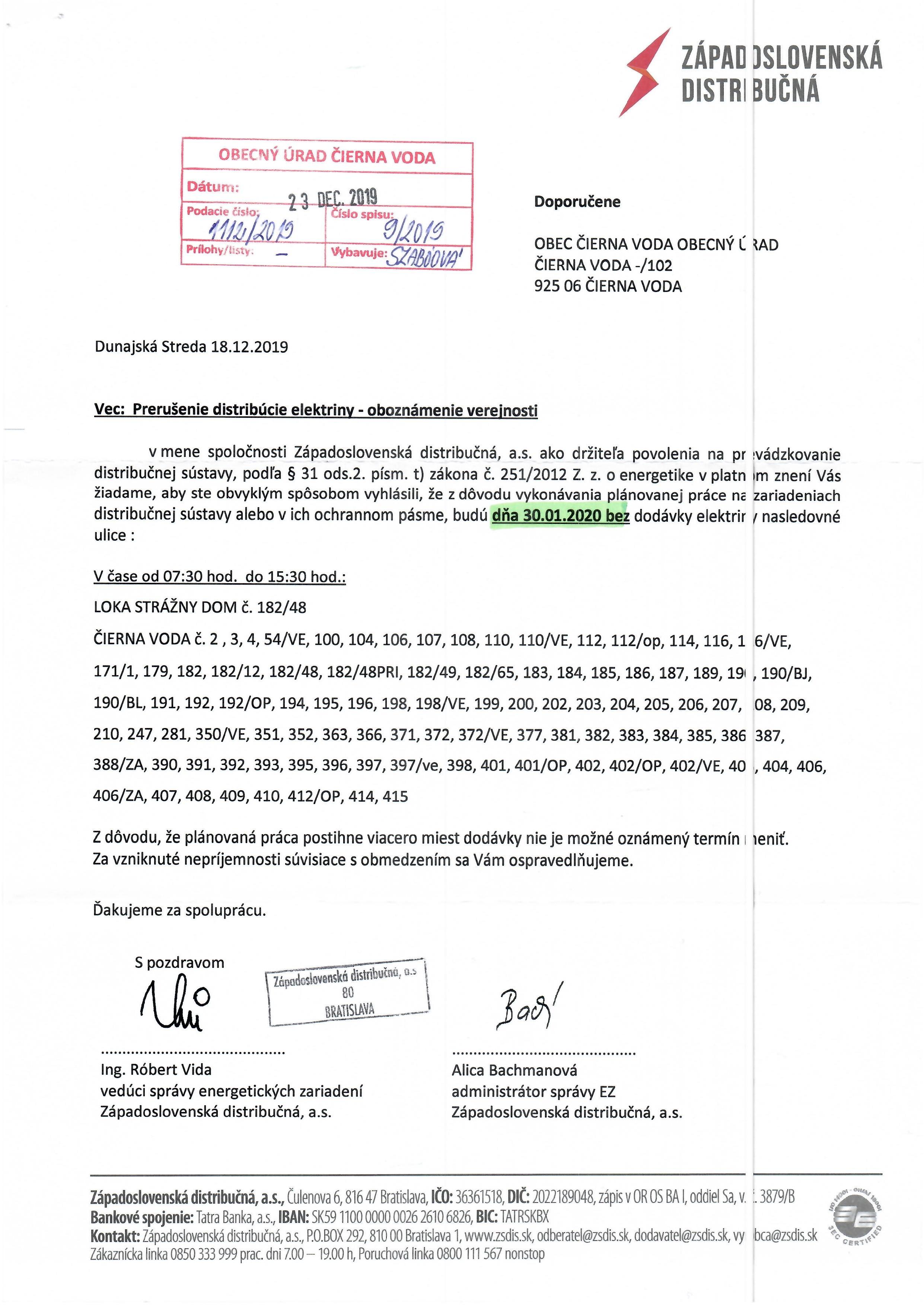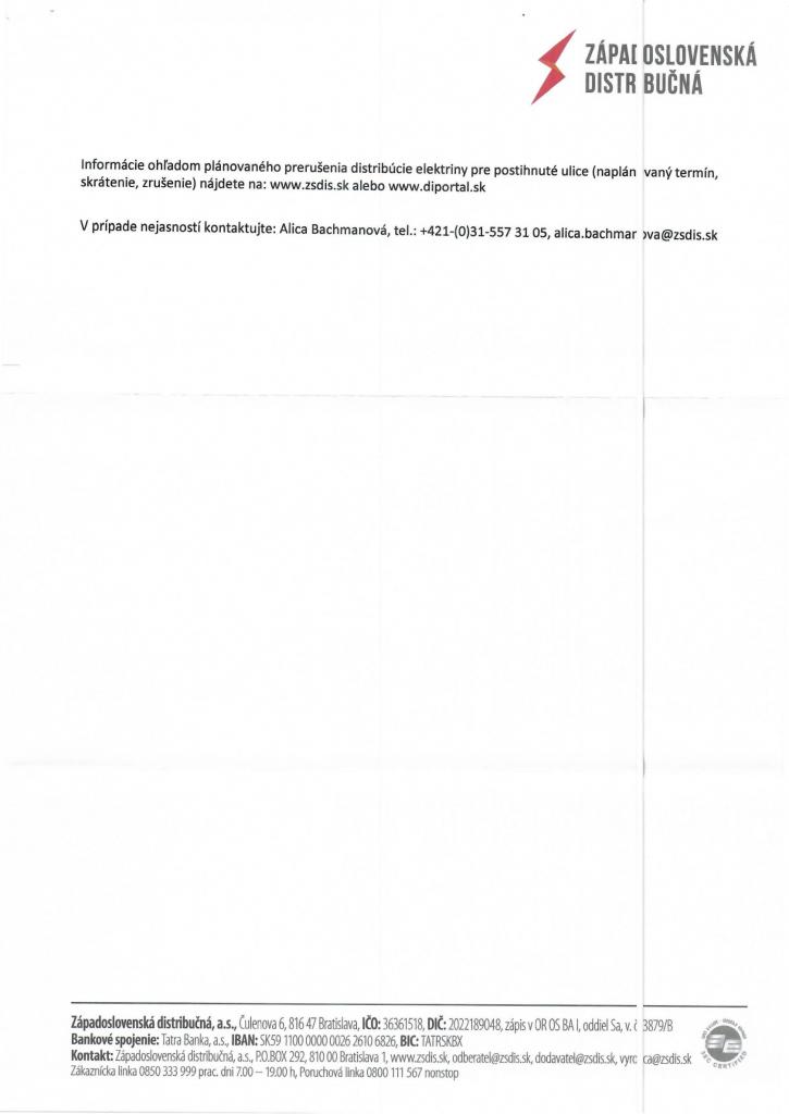 Západoslovenská distribučná, a.s. oznamuje občanom, že z dôvodu vykonávania plánovanej práce na zariadeniach distribučnej sústavy alebo v ich ochrannom pásme, budú dňa 30.01.2020 od 7:30 hod. do 15:30 hod. bez dodávky elektriny niektoré ulice. -