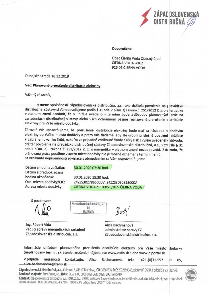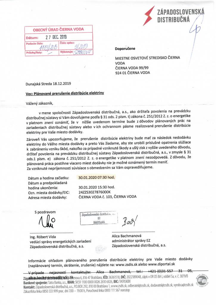 Západoslovenská distribučná, a.s. társaság tudatja a lakosokkal, hogy munkálatok miatt, 2020.01.30-án 7:30-tól 15:30-ig falunk egyes részein szünetelni fog az áramszolgáltatás.