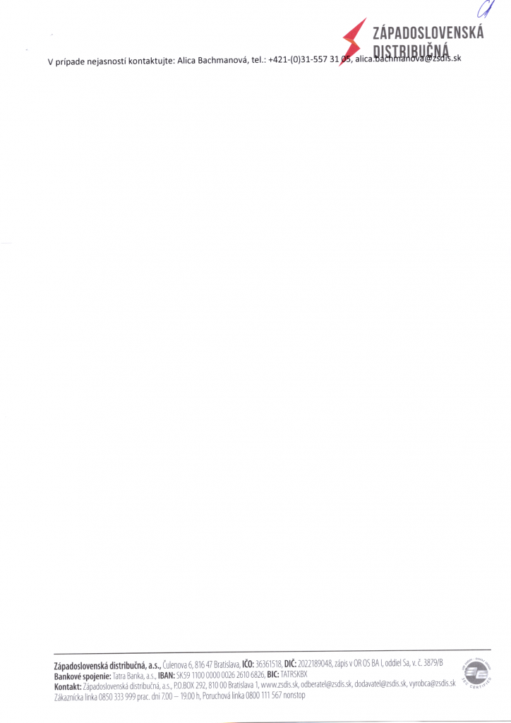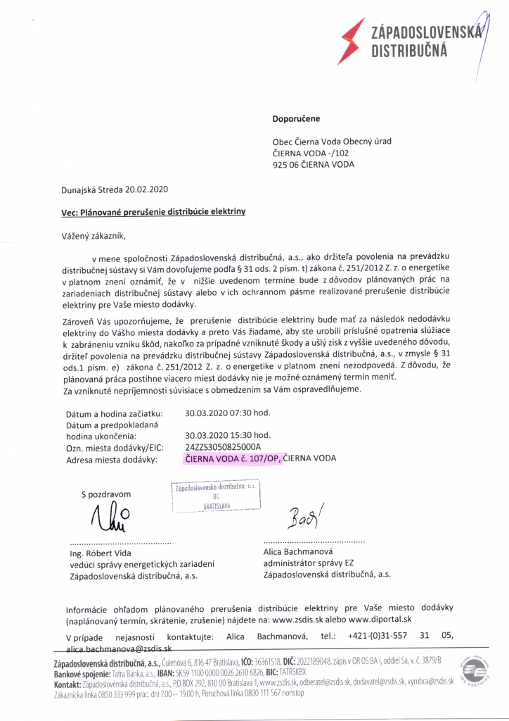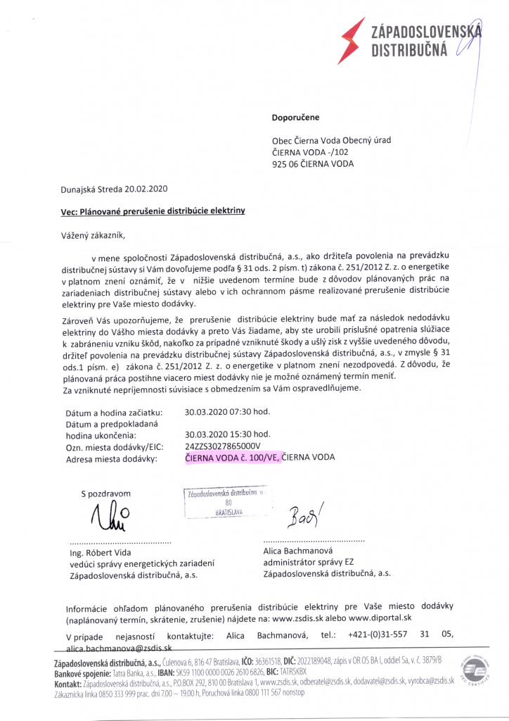 Západoslovenská distribučná, a.s. társaság tudatja a lakosokkal, hogy munkálatok miatt, 2020.03.30-án 7:30-tól 15:30-ig falunk egyes részein szünetelni fog az áramszolgáltatás.