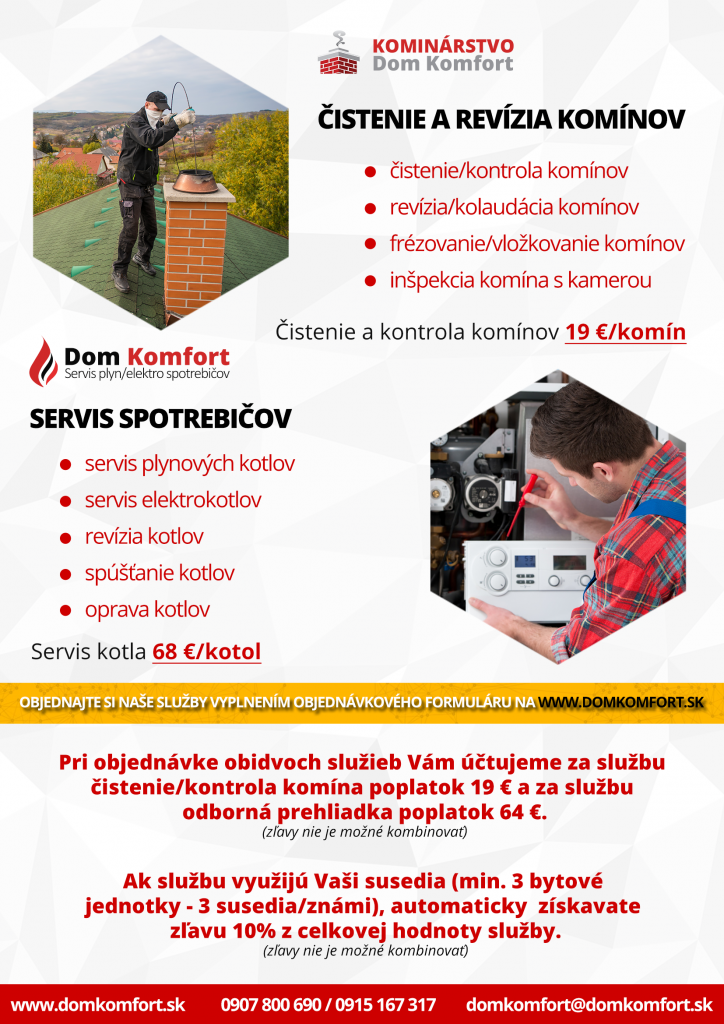 Felhívjuk a kedves lakosok figyelmét, hogy 2021. június 10-én (csütörtök) a Dom Komfort kéményseprőcég bebiztosítja az éves kéményseprést és a gázkazánok éves szervizelését. Érdeklődés esetén jelentkezni lehet a következő tel.számon: 0907 800 690 vagy a www.domkomfort.sk weboldalon.