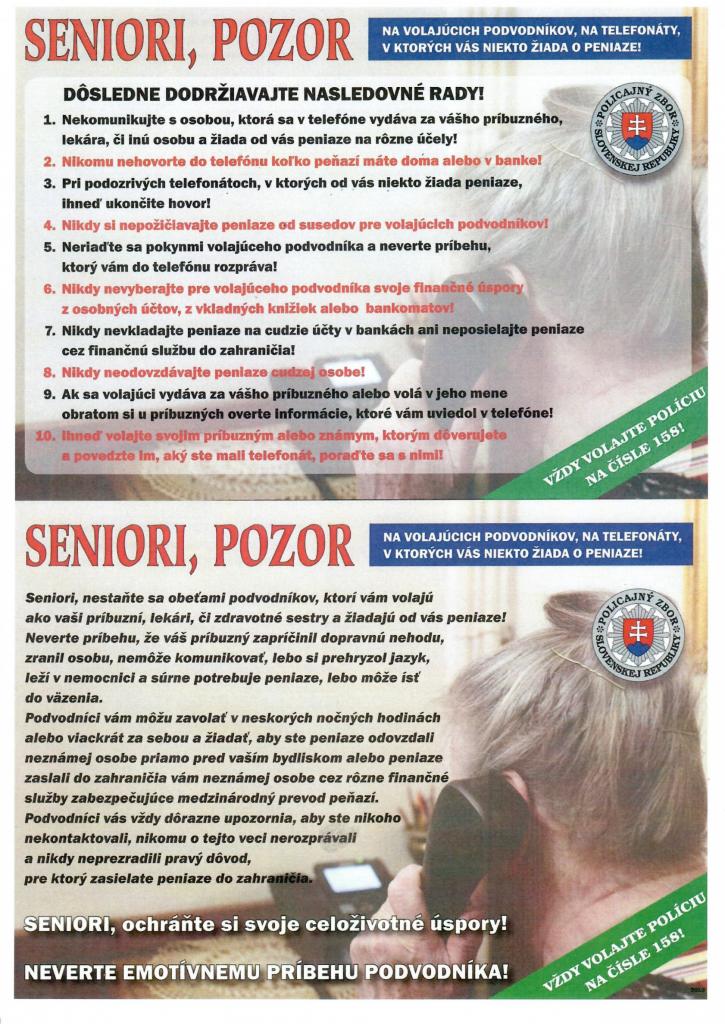 Okresné riaditeľstvo Policajného zboru v Galante upozorňuje najmä starších spoluobčanov na podvodníkov, ktorí sa snažia vylákať nemalé finančné sumy od dôverčivých seniorov.