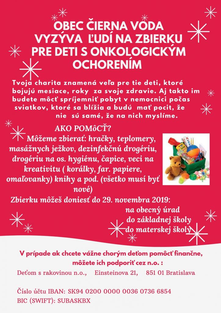 Obec Čierna Voda vyzýva ľudí na zbierku pre deti s onkologickým ochorením -