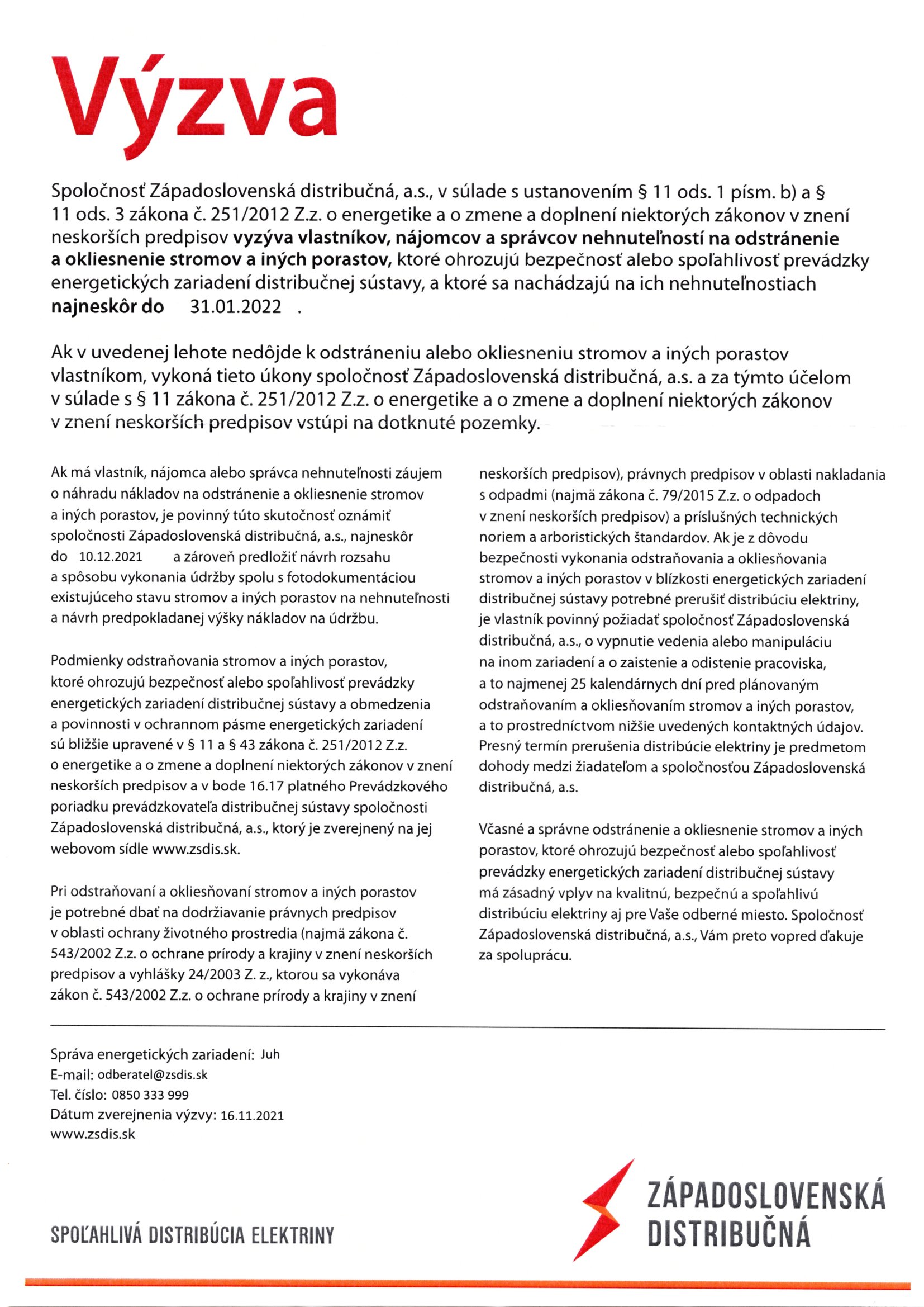 Výzva na odstránenie o okliesnenie stromov a iných porastov okolo elektrického vedenia!